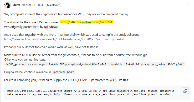 I spent time trying to compile the modules using the kernel.org sources, but got “Oops” errors when enabling them on the printer. A forum comment pointed to a “Tina Linux” kernel source which supposedly worked for their own use case (compiling the wifi module).
